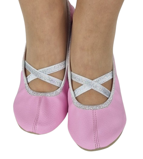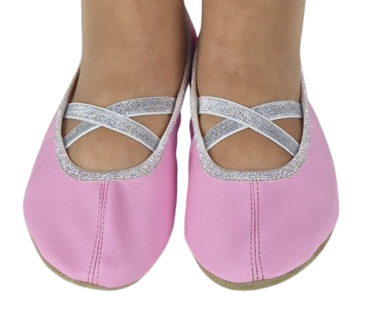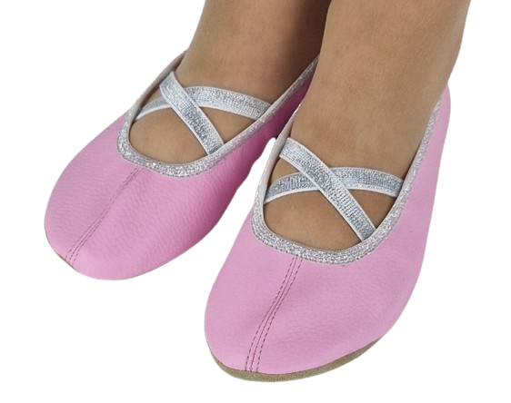 Baletki różowe ze srebrnymi gumkami na krzyż