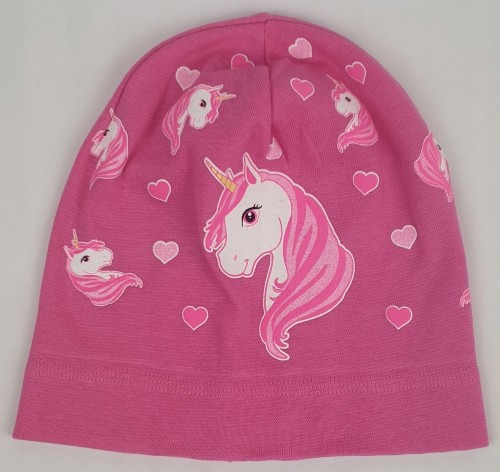 Ścisła tkanina ściągaczowa z podwójną warstwą na uszka. Modny nadruk jednorożca przyciąga oko. Taka czapka może być dopełnieniem stylizacji naszej pociechy.