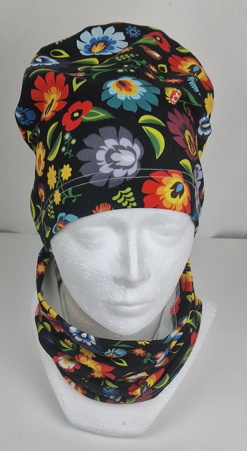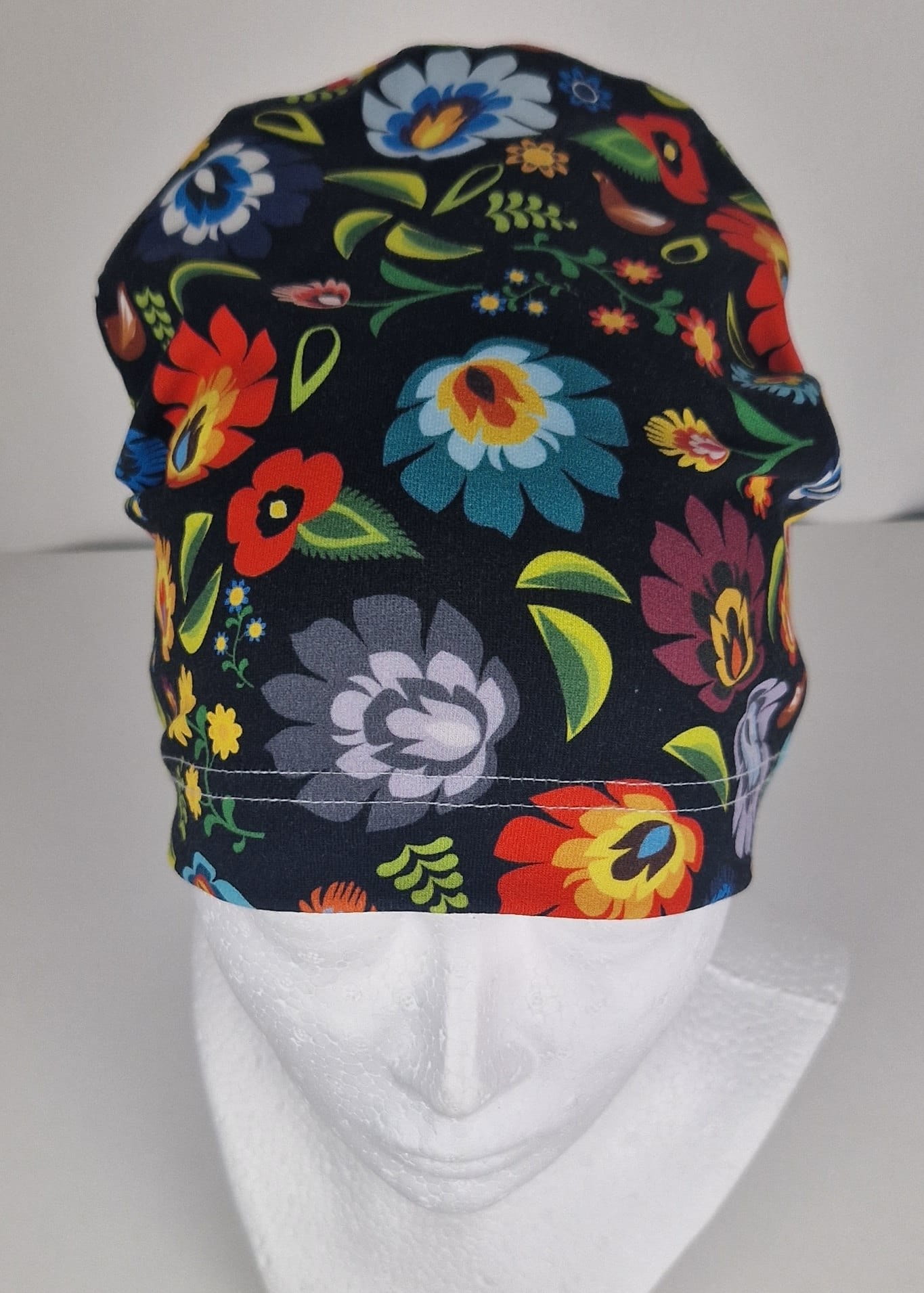 Bawełniana czapka z kominem z pięknym folkowym nadrukiem.