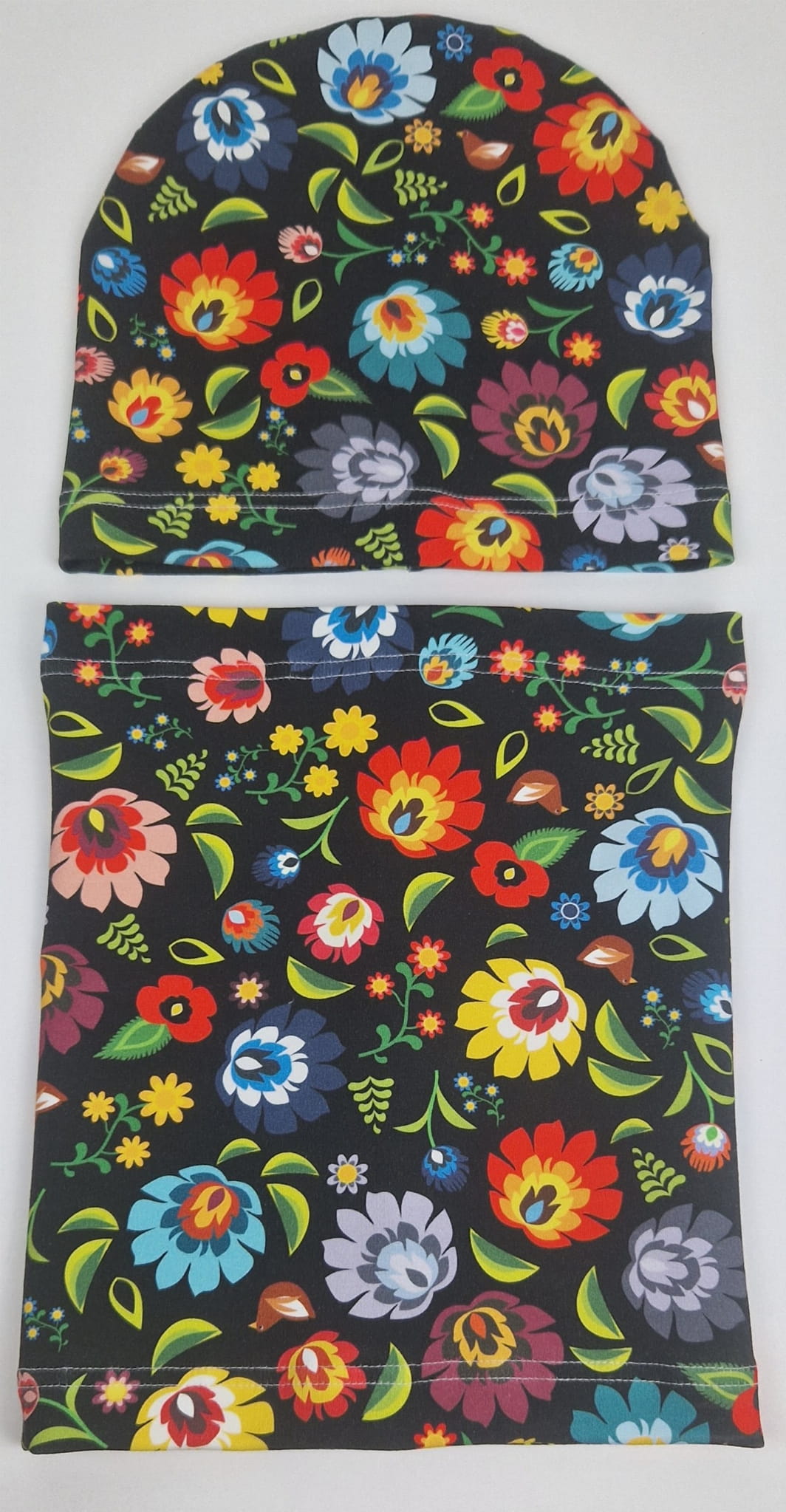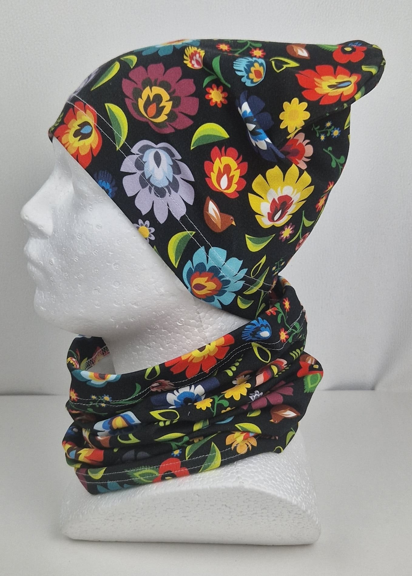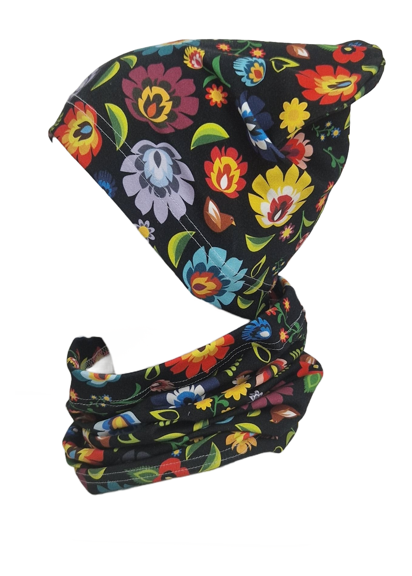 Czapka z kominem bawełniana wzór folkowy dla dzieci i dorosłych