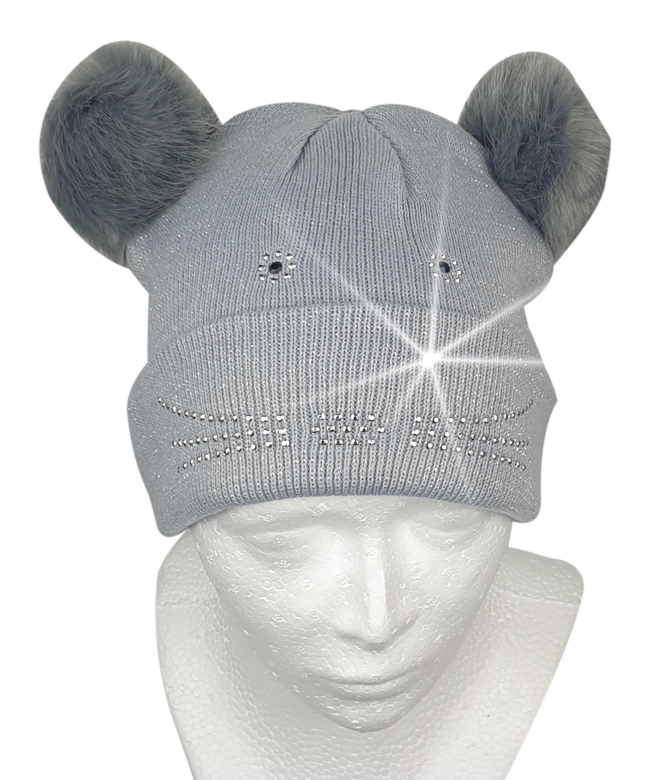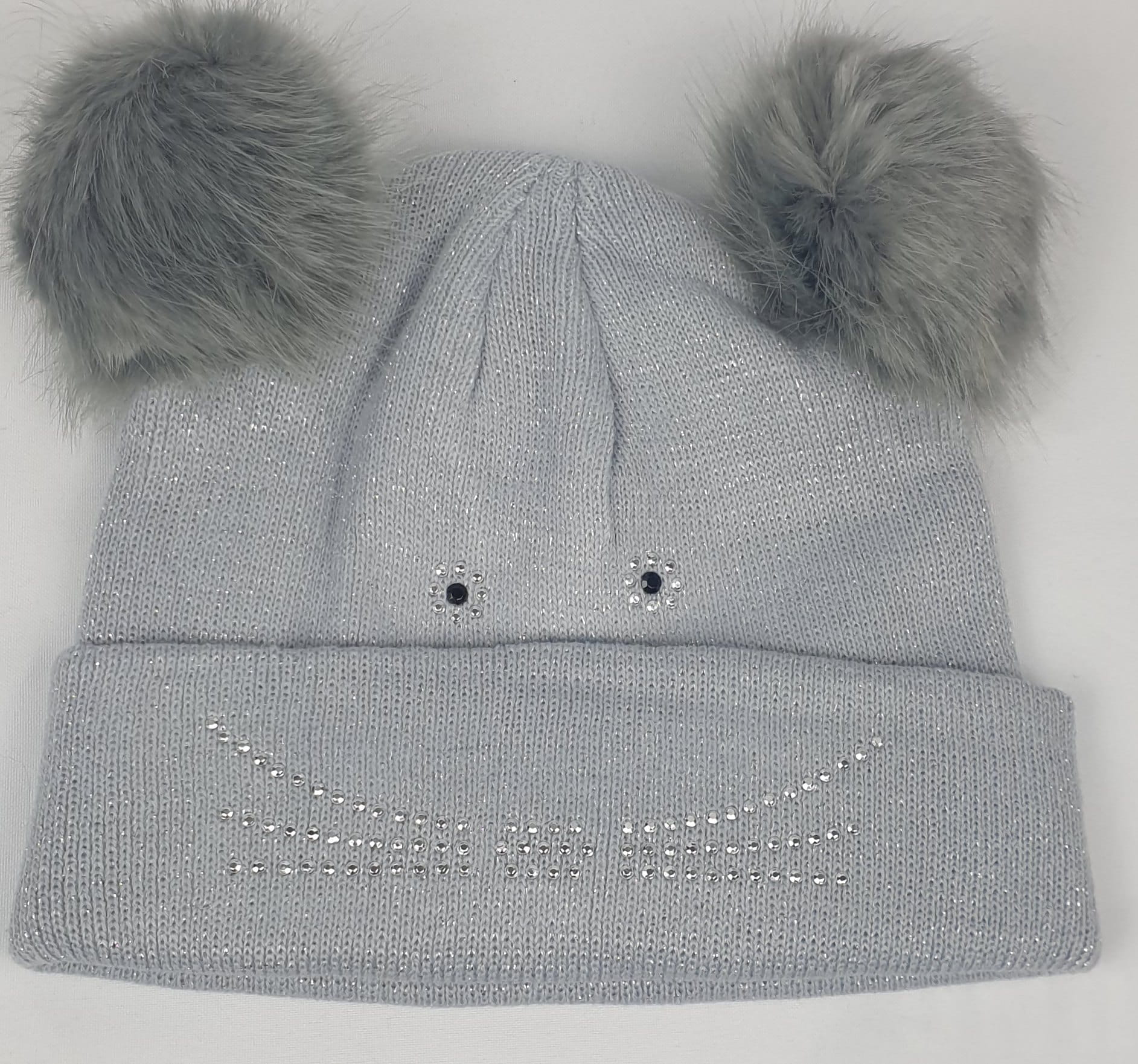 Czapka w kolorze popielatym ze srebrną nitką. Bardzo ciepła i miła w dotyku. Czapka od środka jest odszyta dodatkową warstwą dzianiny. Nasze uszy są bezpieczne od przewiania, bo chroni je kilka warstw materiału. Tkanina rozciągliwa (dzianina) nadaje się dla nastolatków i dorosłych. Atut czapki to świecące elementy i modne pomponiki.