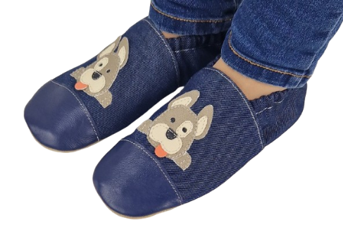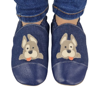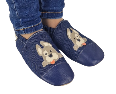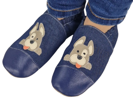 Prezentujemy kapcie - "nasze" dreptule" granatowe jeansowe z naszytą aplikacją psów: