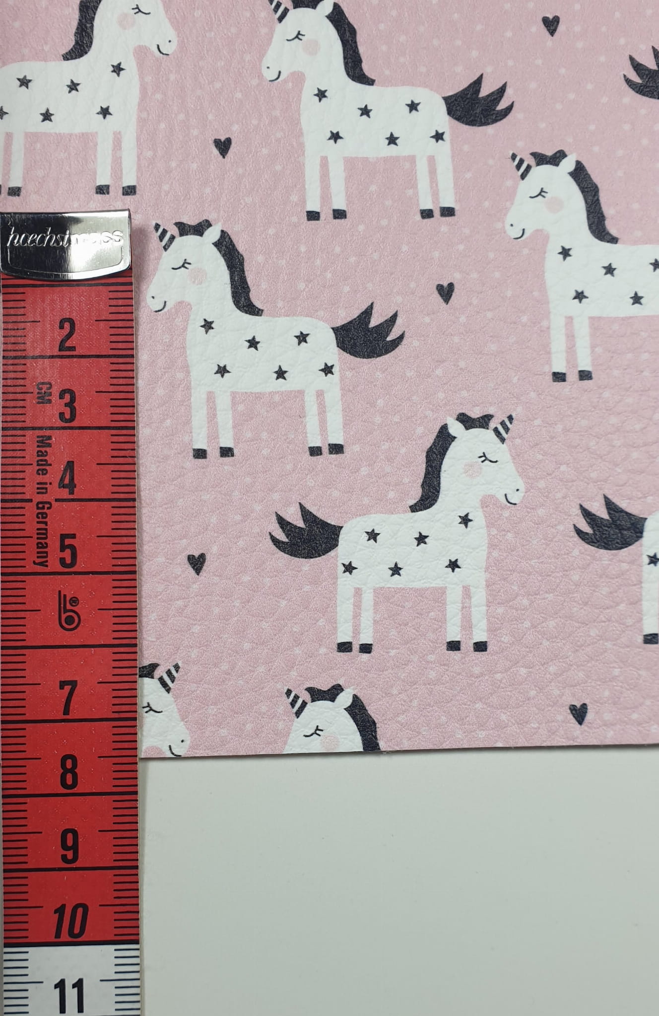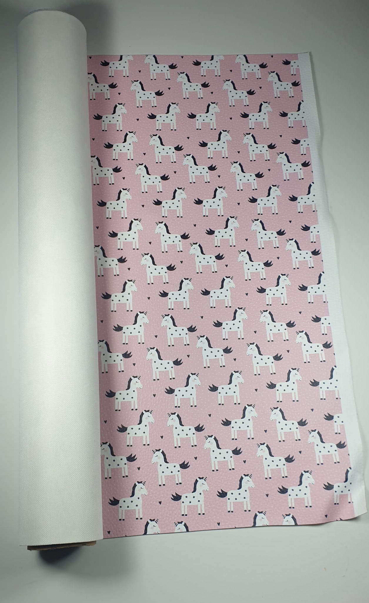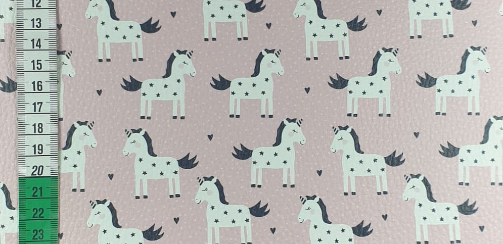 Wykonany na ekoskórze nadruk ze wzorem jednorożców jest bardzo trwały. Nośnik ekoskóry to tkanina poliestrowa. Powierzchnia z nadrukiem posiada delikatne przetłoczenia imitujące naturalną skórę.