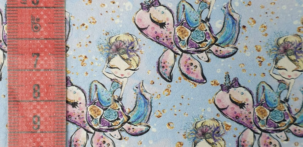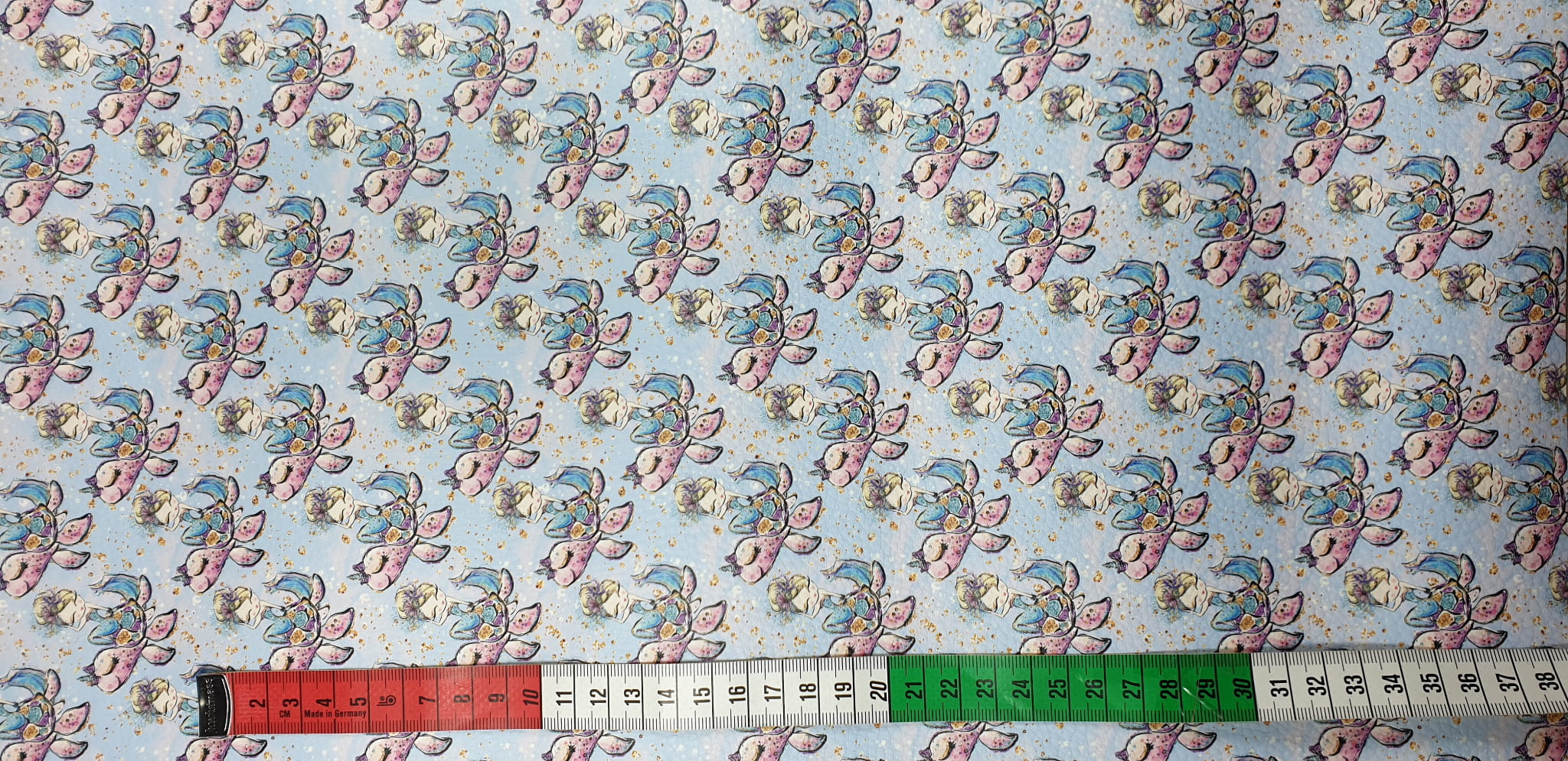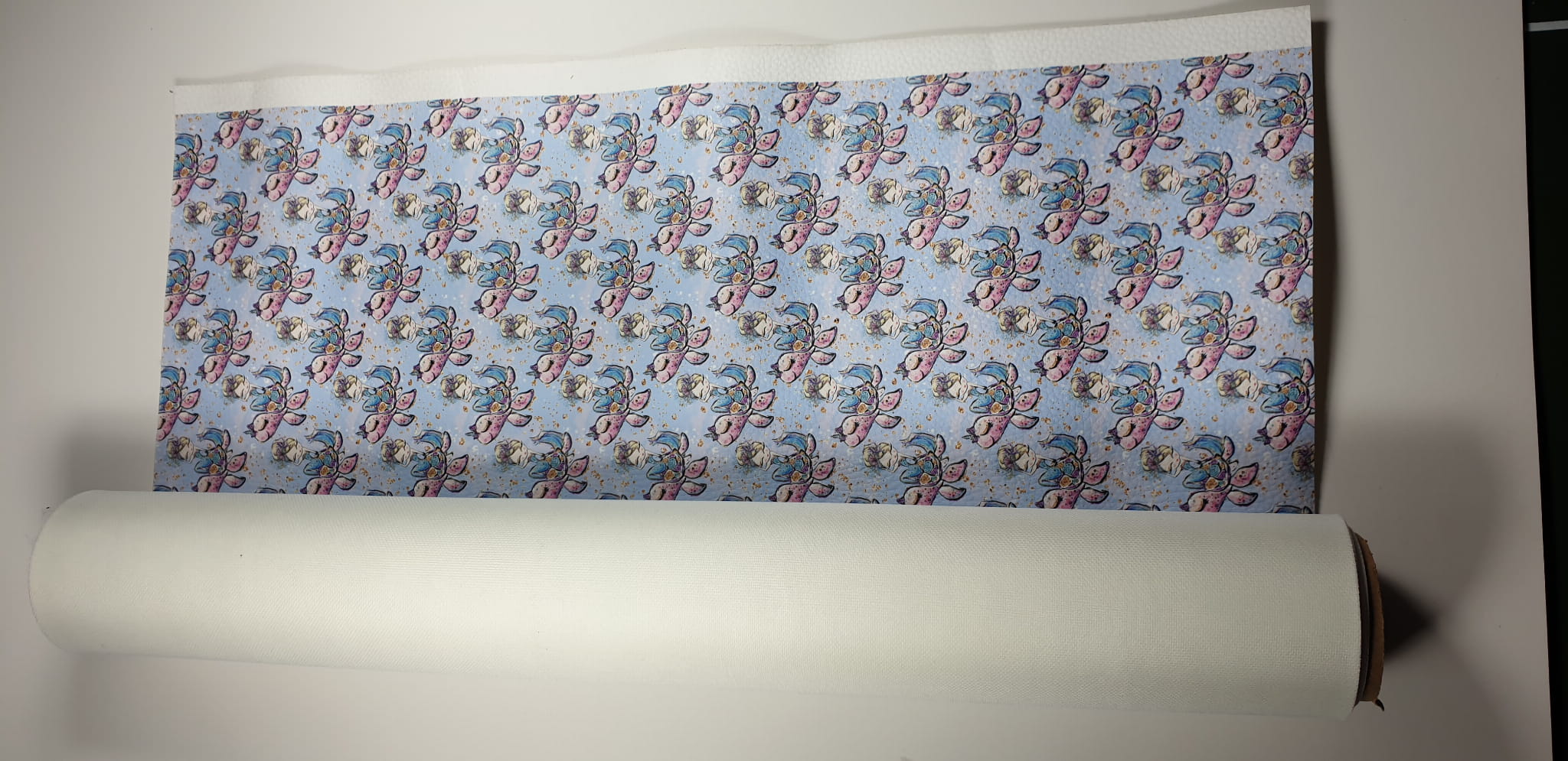 Wykonany na ekoskórze nadruk ze wzorem jednorożców jest bardzo trwały. Nośnik ekoskóry to tkanina poliestrowa. Powierzchnia z nadrukiem posiada delikatne przetłoczenia imitujące naturalną skórę.