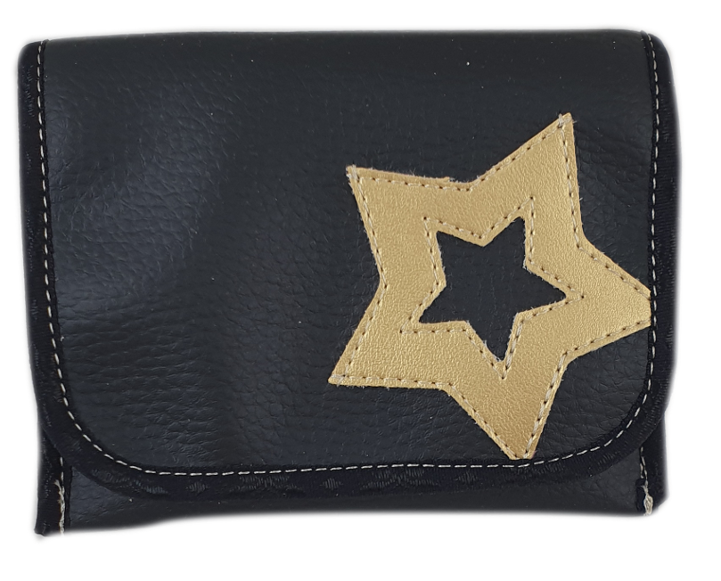 Wykonane z dwóch warstw wytrzymałej, nieprzemakającej ekoskóry. Zewnętrzna czarna z naszytą aplikacją gwiazdki, wewnętrzna w kolorze złotym. Zapięcie na rzep.