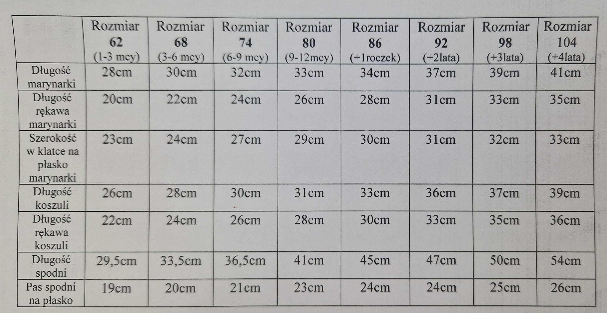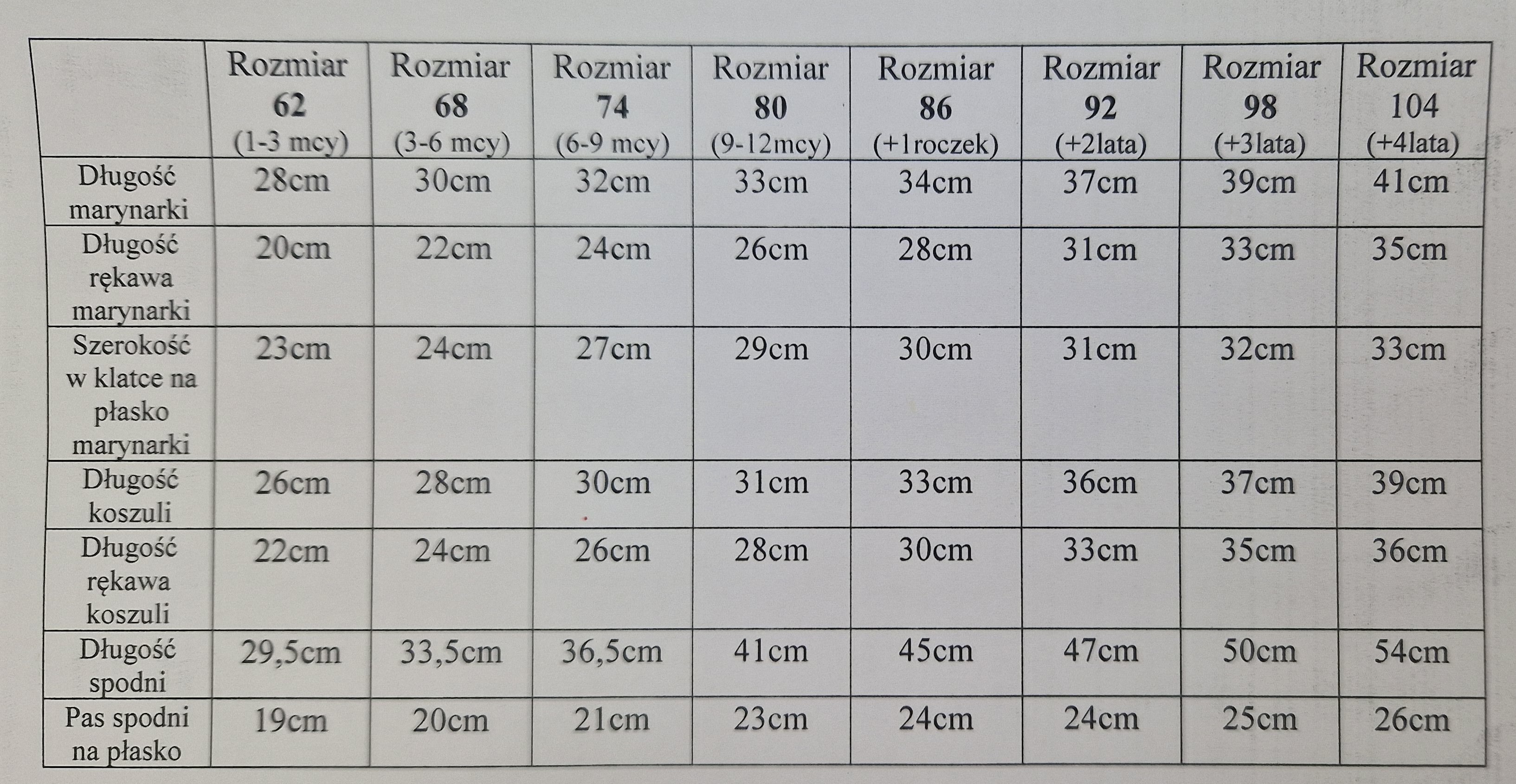 Poniżej zdjęcie tabeli dostępnych rozmiarów.