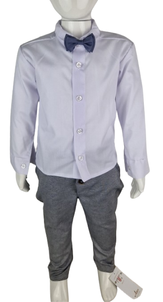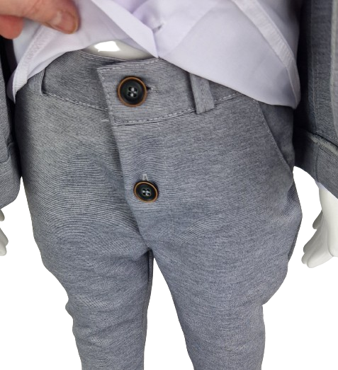 Spodnie są dopasowane, ale jednocześnie zapewniają swobodę ruchów, co jest ważne dla aktywnych chłopców. Zapięcie na guziki ułatwiają ubieranie i zdejmowanie spodni. Całość tworzy harmonijny zestaw, który doskonale sprawdzi się zarówno na uroczystościach, jak i podczas rodzinnych spotkań czy innych formalnych okazji, dodając małemu dżentelmenowi niepowtarzalnego wdzięku i stylu.