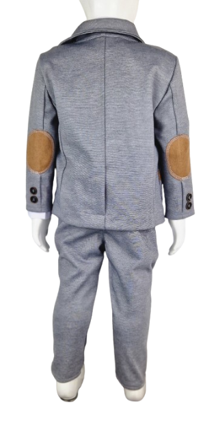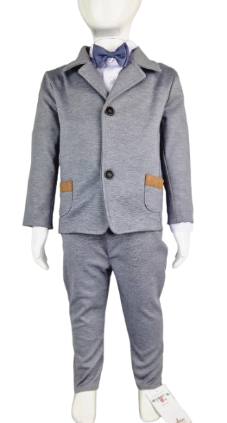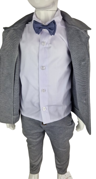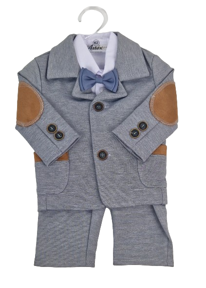 Garnitur dla chłopca to elegancki i stylowy zestaw, który składa się z marynarki, koszuli, muszki i spodni, wszystkie wykonane z wysokiej jakości dzianiny bawełnianej. Dzianina ta nie tylko zapewnia komfort noszenia, ale także dodaje lekkości i elastyczności całemu garniturowi, co jest szczególnie ważne dla aktywnego trybu życia maluszków.