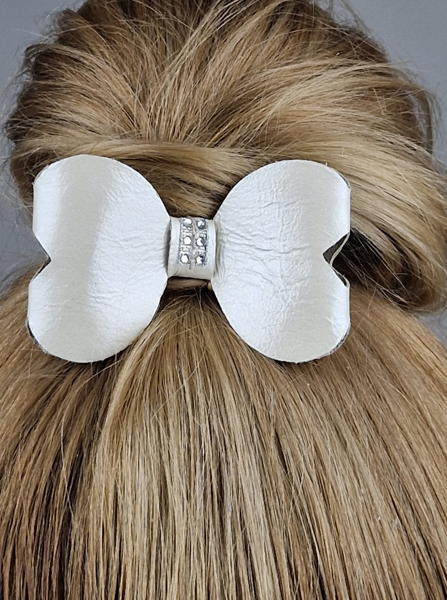 Gumka do włosów z kokardą. Kokarda wykonana ze skóry naturalnej. Na środku wszyte błyszczące kryształki.