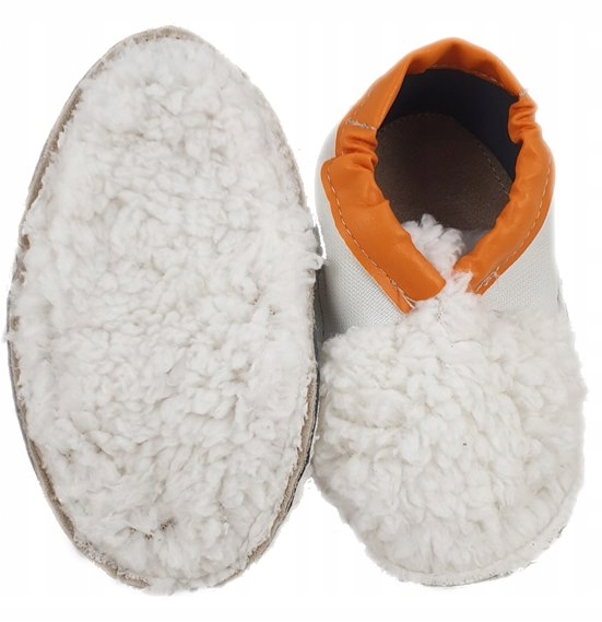 Dreptulki typu soft sole wspierają prawidłowy rozwój stopy dziecka. Naturalna skóra zamszowa (dwoina cielęca) zastosowana na podeszwy sprawia, że buciki się nie ślizgają, dają naturalny opór stopie. Taka podeszwa sprawia, że delikatna skóra dziecka oddycha i nie poci się. Pamiętajmy, aby dbać o maleńkie stopki. Wewnątrz jest wszyta dzianina (ocieplenie), aby małej stopcie było miękko i cieplutko. Wzmocniona podeszwa daje dłuższą żywotność. Użyta dwoina ta posiada naturalne właściwości antypoślizgowe. Jeśli podeszwa się zabrudzi wystarczy włos poruszyć szczotką, lub po prostu wyprać dreptulki w max. 30stopniach. Wewnątrz jest druga warstwa skóry naturalnej, aby małej stopcie było miękko.