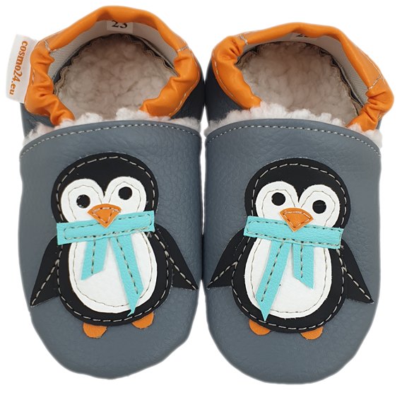 Kapcie Dreptulki Paputki ocieplane ekoskóra popiel aplikacja pingwin R. 20-34