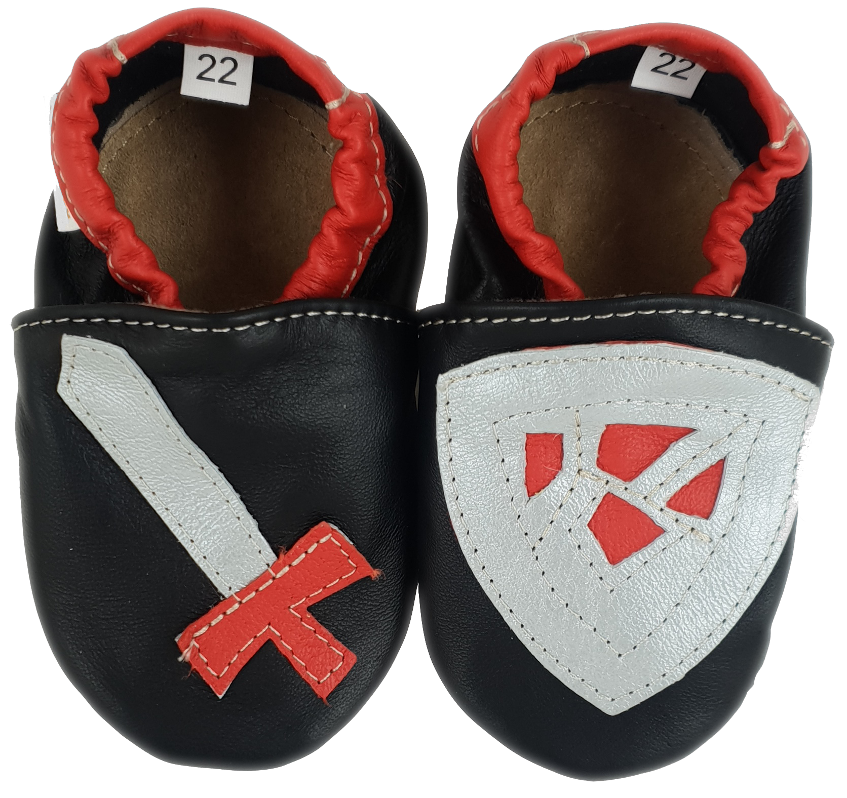 Kapcie Dreptulki skóra licowa czarna aplikacja miecz z tarczą czerwony r. 20-34