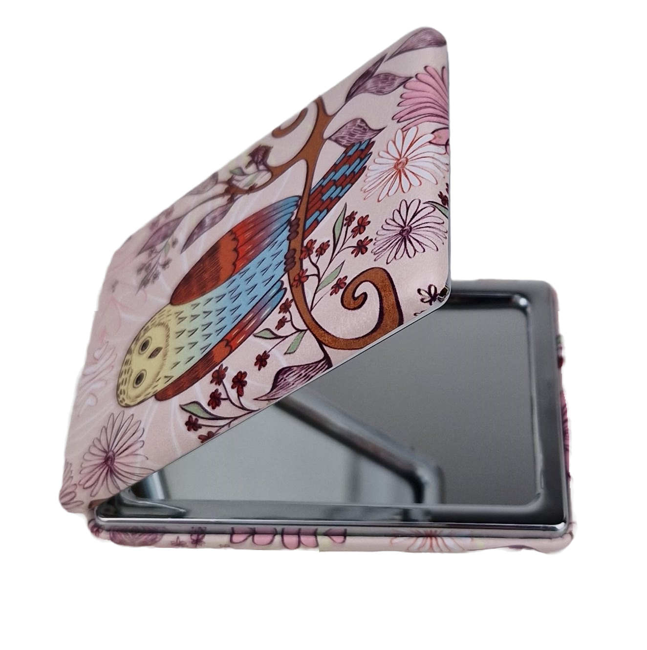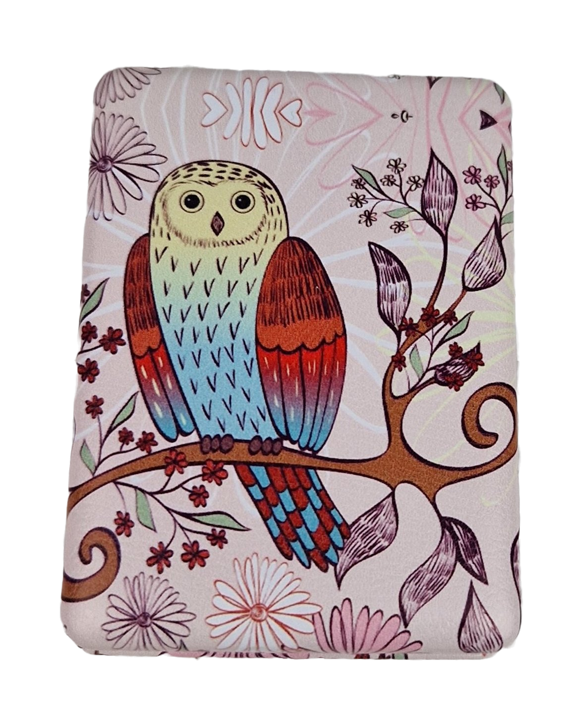 Piękna grafika z sową w pastelowych kolorach. Wewnątrz dwustronne lusterka z normalnym odbiciem i powiększonym. Zamykane na delikatny magnez, dzięki czemu ładnie się domyka.