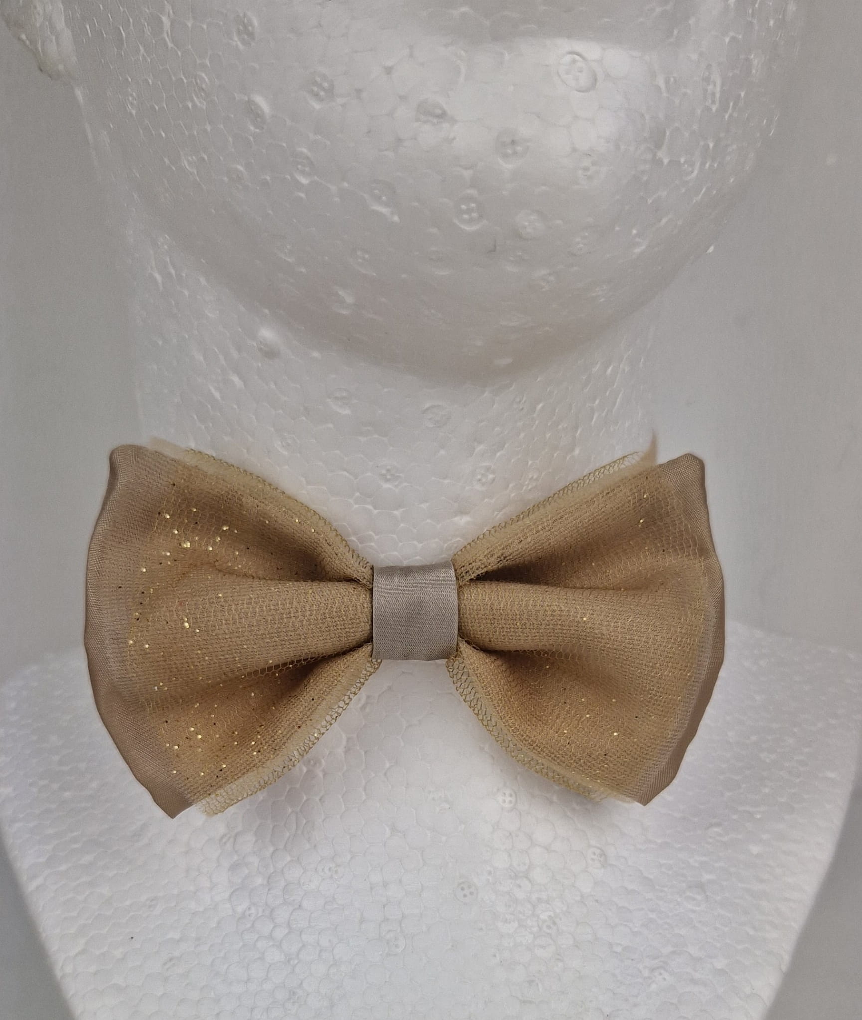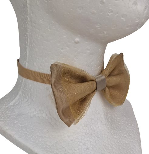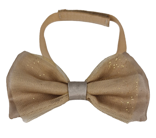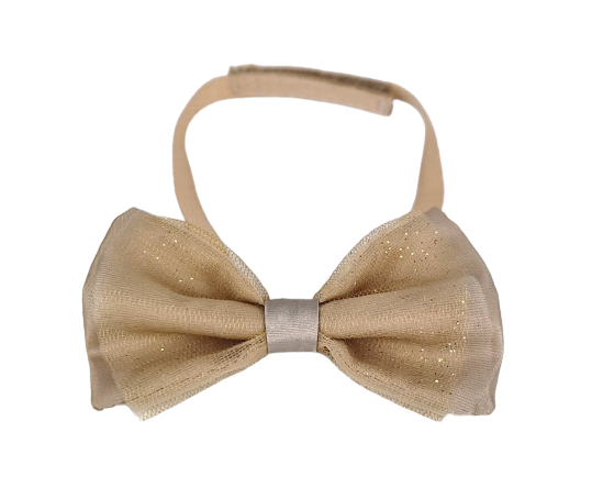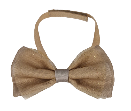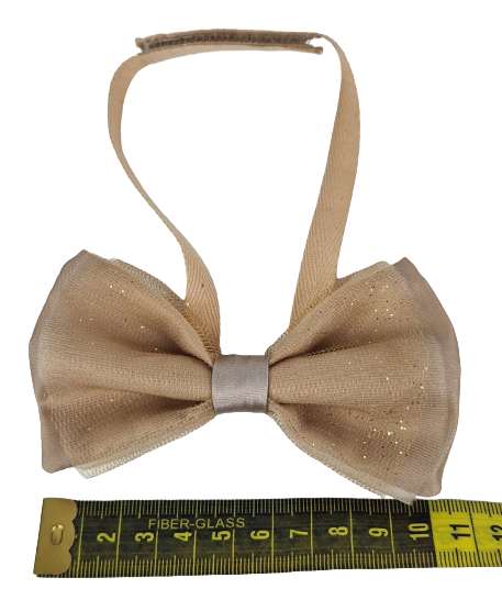 Muszka starannie wykonana z 3 warstw materiału: satynowej tkaniny + warstwy szyfonu + warstwy tiulu brokatowego. Zapinana za pomocą rzepa. Obwód od 26 cm do 32cm.
