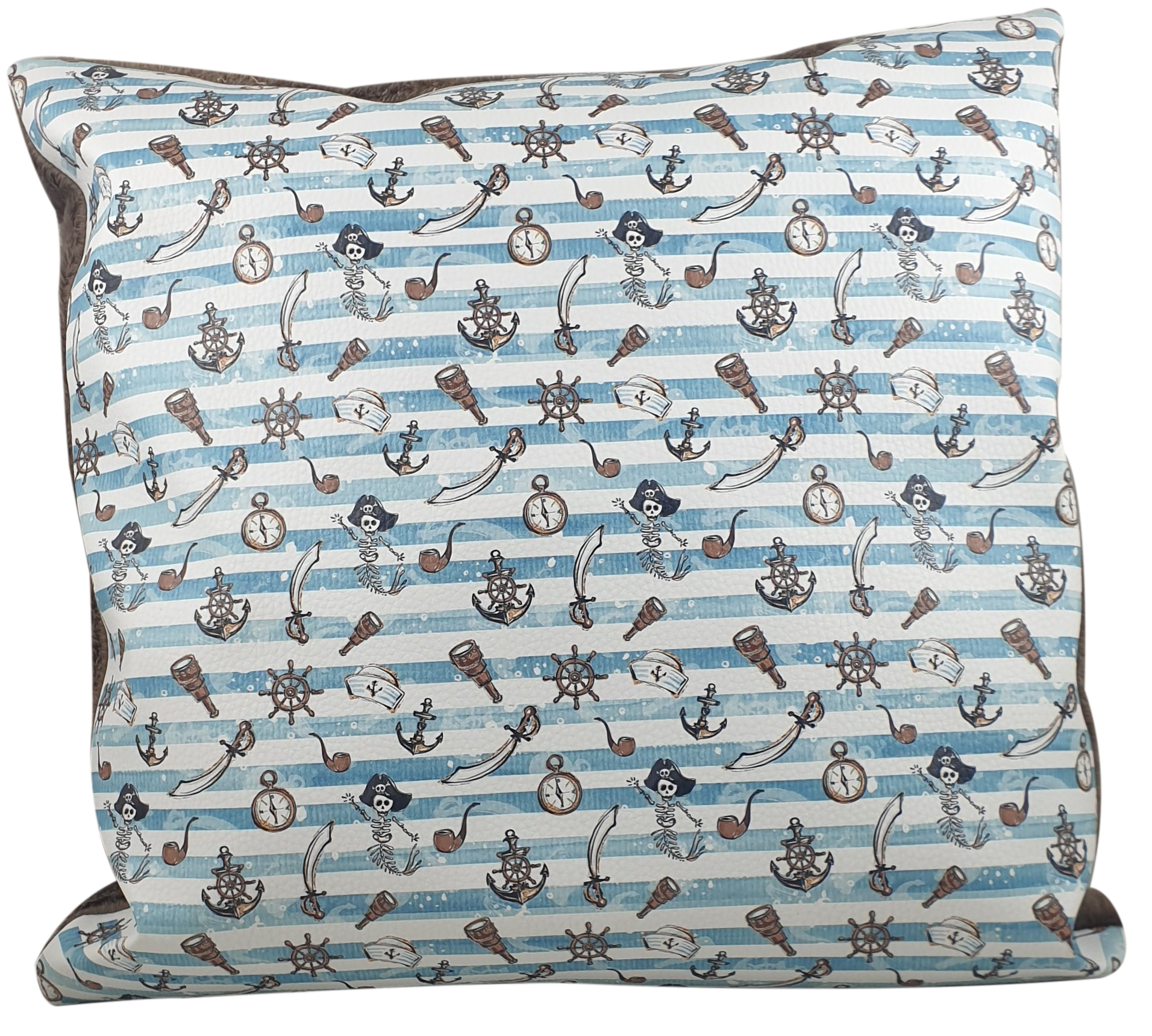 Jedna strona to ekoskóra z nadrukiem (motyw morski-piracki), druga strona to mięciutka tkanina do której z przyjemnością się przytulimy. Wewnątrz jest poduszka z wkładem wysokiej jakości kulki silikonowej.