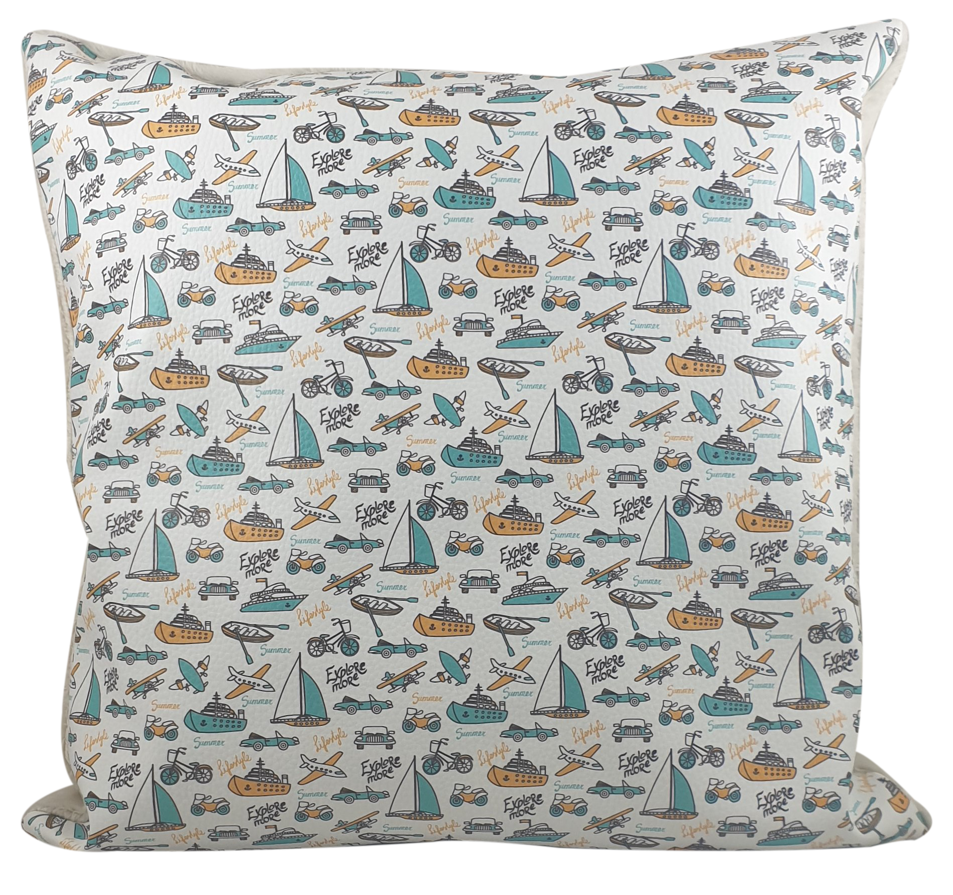 Jedna strona to ekoskóra z nadrukiem (motyw różnych pojazdów), druga strona to mięciutka tkanina do której z przyjemnością się przytulimy. Wewnątrz jest poduszka z wkładem wysokiej jakości kulki silikonowej.