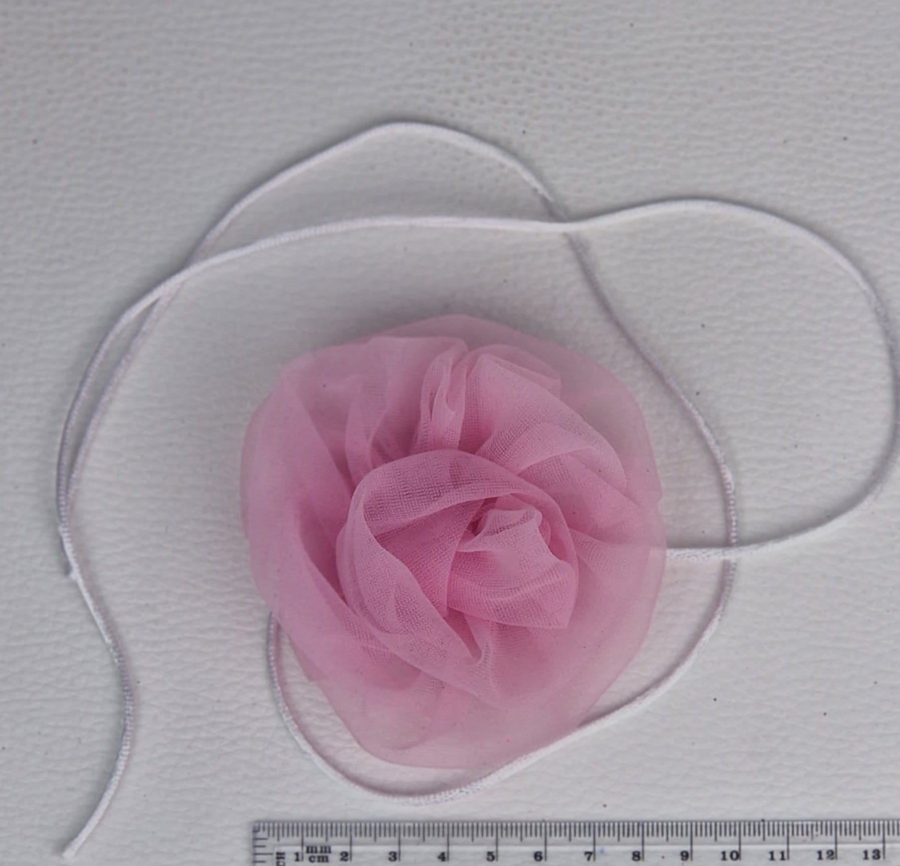 Róża wyposażona jest w satynowy sznurek (długość 1m) do zawiązania na szyi lub ręce, oraz agrafkę jeśli zechcemy przypiąć ozdobę do naszej odzieży (bluzki, płaszcza, kurtki, paska...)