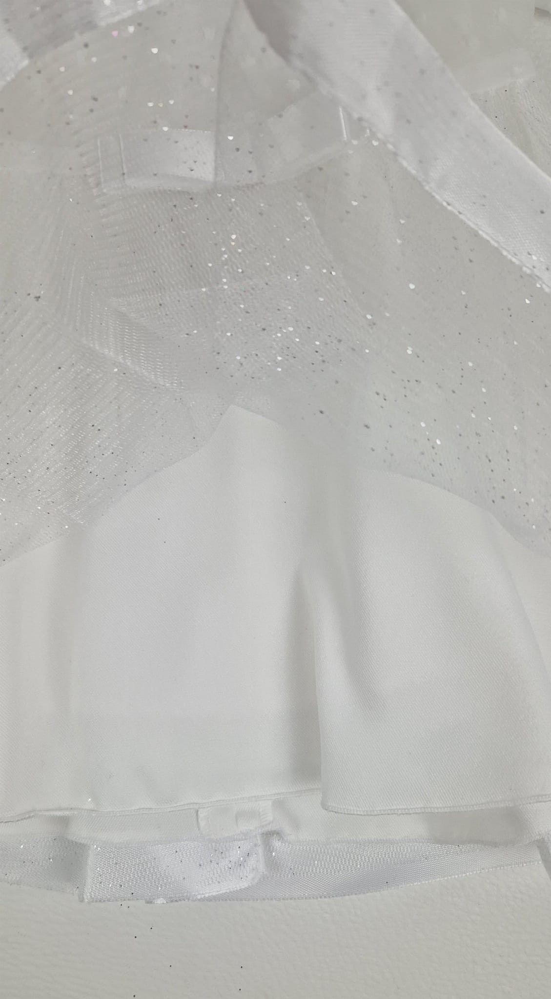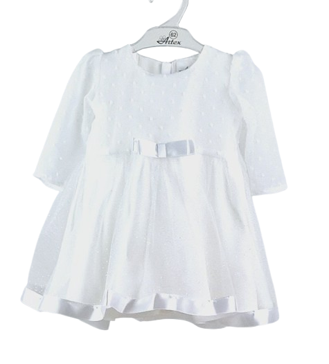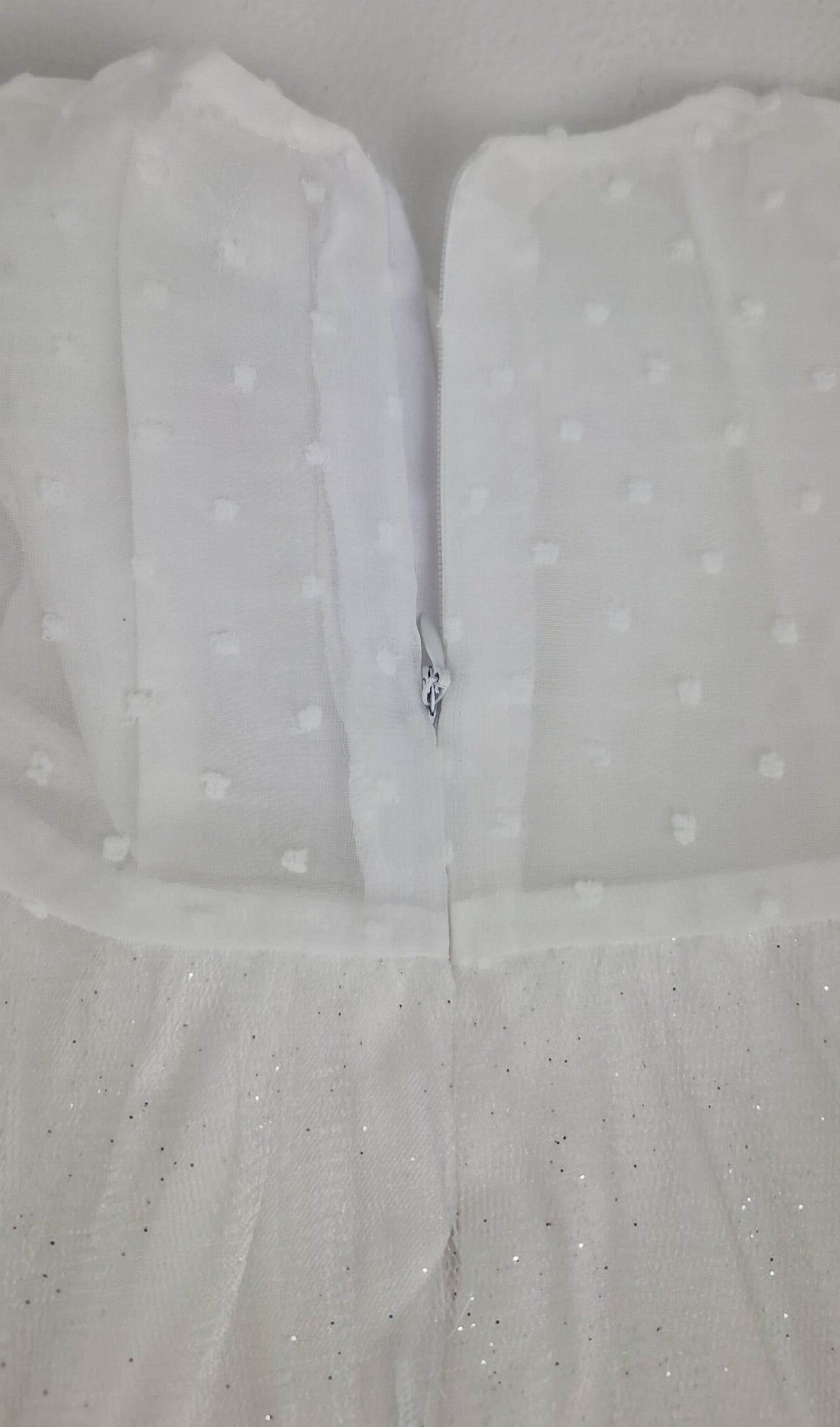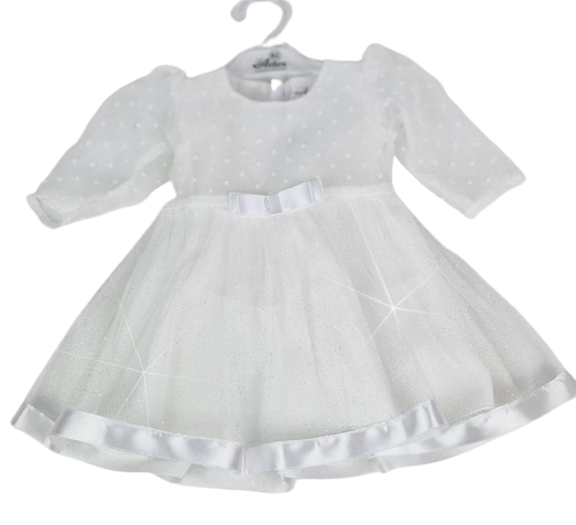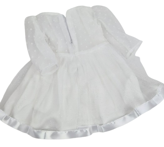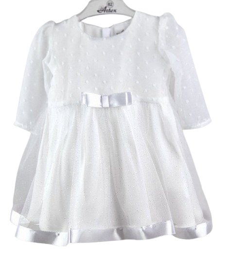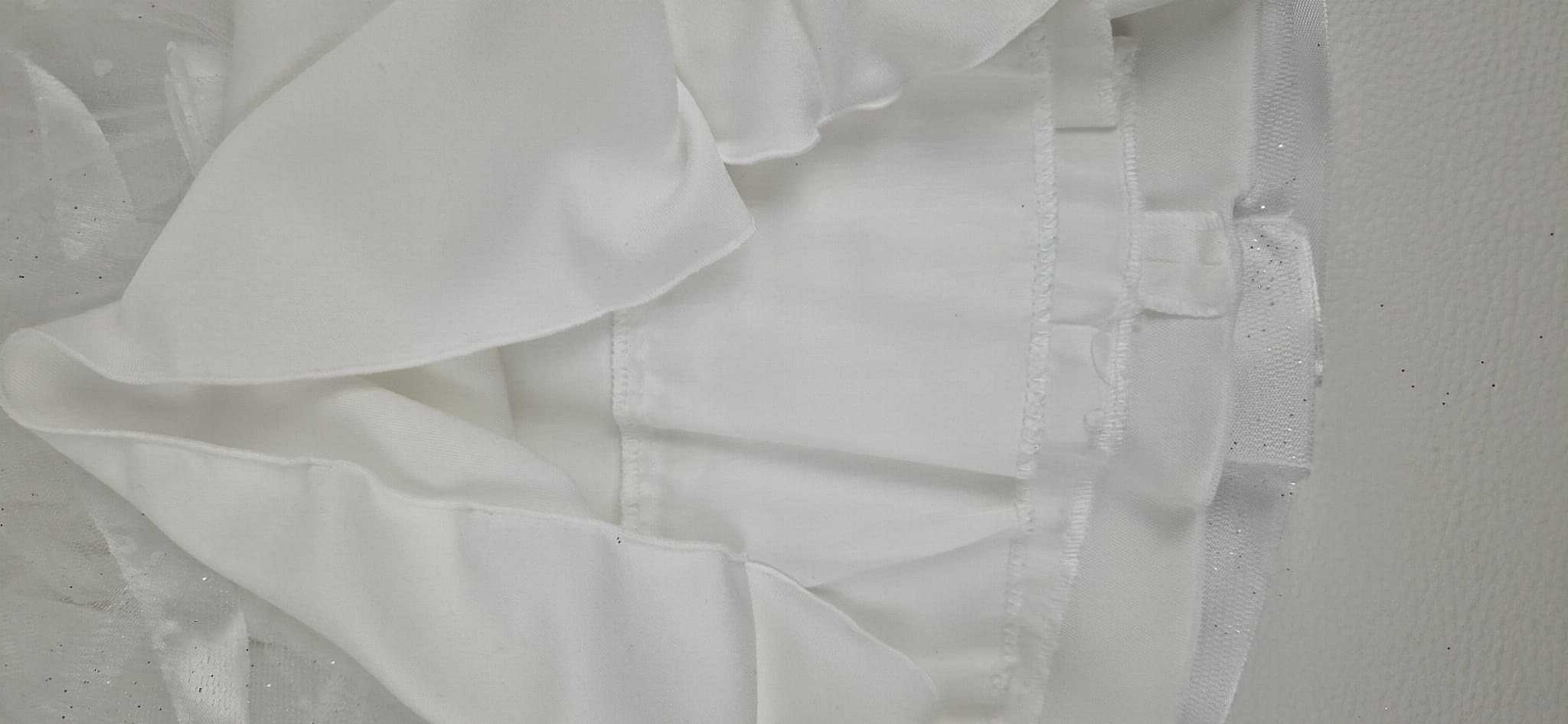 Wykonana z delikatnej tkaniny, ta sukienka emanuje subtelnością i klasyką. Jej biała barwa symbolizuje niewinność i czystość, jednocześnie dodając uroku i wdzięku małej dziewczynce w dniu jej chrztu lub pierwszych urodzin.