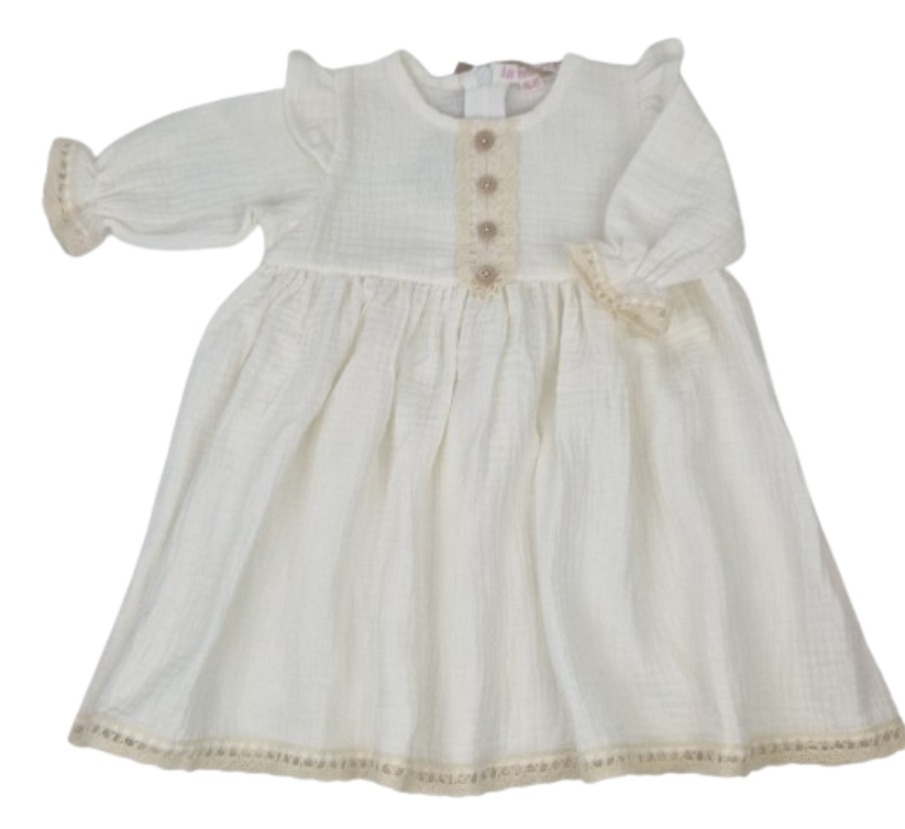 Ta urocza sukienka dla niemowlaka wykonana jest z delikatnego muślinu bawełnianego, zapewniając wyjątkowy komfort i przewiewność dla delikatnej skóry Twojego maluszka. Muślin jest znany ze swojej lekkości i miękkości, co czyni go idealnym materiałem na dziecięce ubranka, szczególnie w cieplejsze dni.
