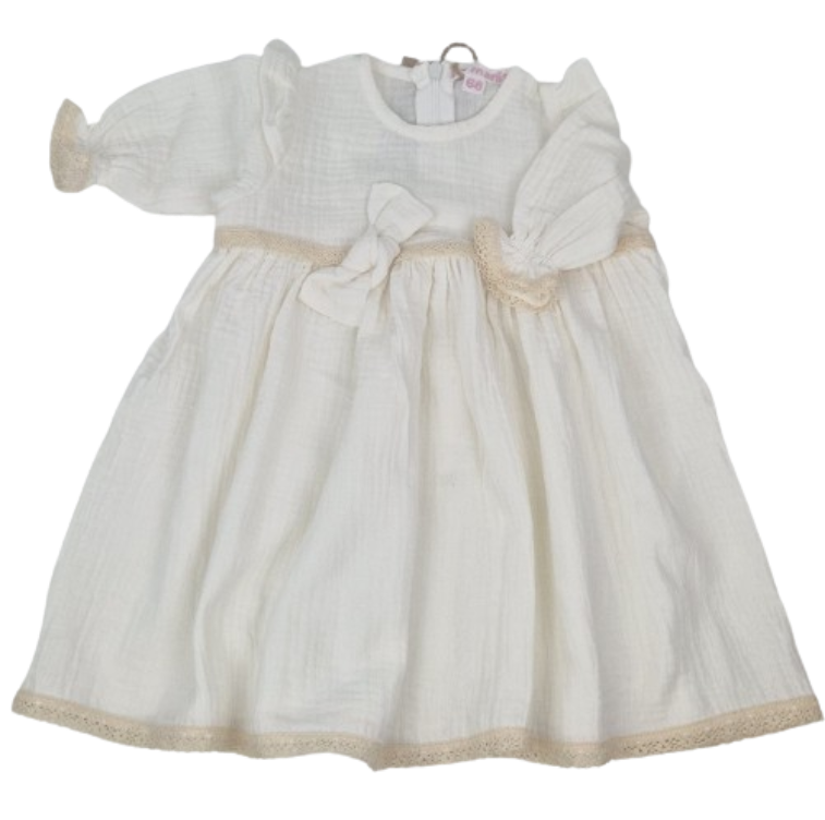 Ta urocza sukienka dla niemowlaka wykonana jest z delikatnego muślinu bawełnianego, zapewniając wyjątkowy komfort i przewiewność dla delikatnej skóry Twojego maluszka. Muślin jest znany ze swojej lekkości i miękkości, co czyni go idealnym materiałem na dziecięce ubranka, szczególnie w cieplejsze dni.